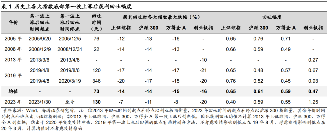 当前市场调整幅度接近历史牛市**波上涨后回撤的均值,关注积极因素带来情绪催化。我们在《旭日初升——2023年**资本市场展望-20221203》中分析过,从牛熊周期、估值、基本面、资金面等维度来看,22年10月底以来A股已经进入新一轮牛市周期,而牛市在**波修复结束后往往会出现进二退一式的回撤。当前上证指数已回吐了**波上涨幅度的0.40、沪深300为0.59、创业板指为1.25、万得全A为0.55。对比历史上牛市**波上涨后的回撤看,当前上证指数在调整空间上已经接近历史,其他指数在时空上调整均已显著(详见表1)。往后看,如前所述,随着政策带动A股市场基本面及资金面进一步改善,A股市场的情绪有望迎来明显修复,进而推动市场行情回暖。