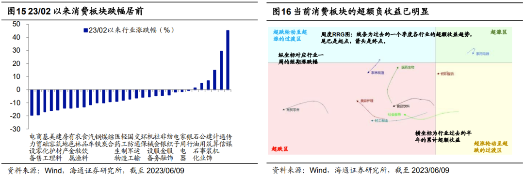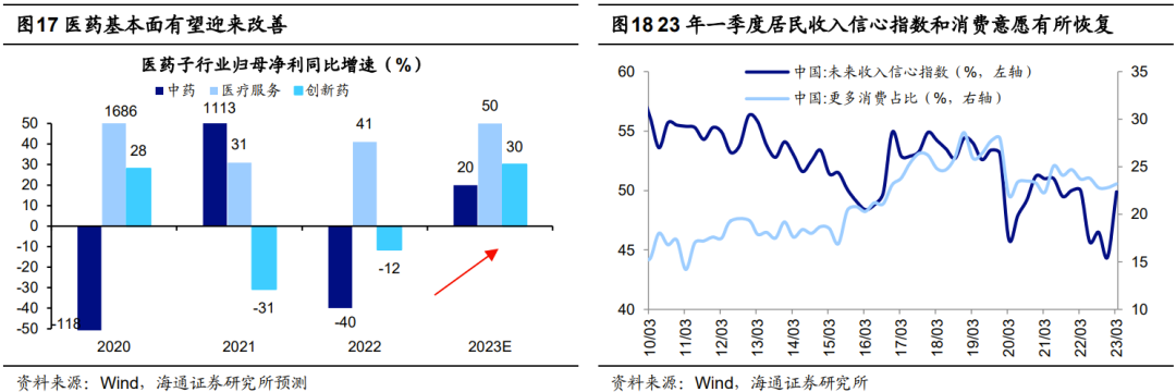 行业层面关注前期领跌的消费,全年维度数字经济是主线。我们在前文分析过,当市场悲观情绪出现边际改善,带动市场行情从底部迅速修复时,前期领跌的板块往往将迎来更大的弹性。今年2月A股市场回落以来消费行业跌幅在所有行业中明显偏大,如零售跌19%、农林牧渔跌14%、食品饮料跌13%、医药跌9%。对比消费板块相较大盘的超额收益趋势,可以发现过去一个季度大多数消费行业已录得明显负收益(详见图16)。往后看,潜在增量政策的支持或有望促使消费基本面进一步向上,进而推动板块行情实现修复。政策方面,促消费一直是目前政策关注的**,实现稳增长目标需要扩内需等相关政策的支持。随着相关政策的发力,消费基本面有望迎来改善。随着基本面改善,消费部分领域有望迎来向上的机遇。结合海通行业分析师和Wind一致预测,预计23年医药板块中中药净利增速为20%、医疗服务为50%、创新药为30%。