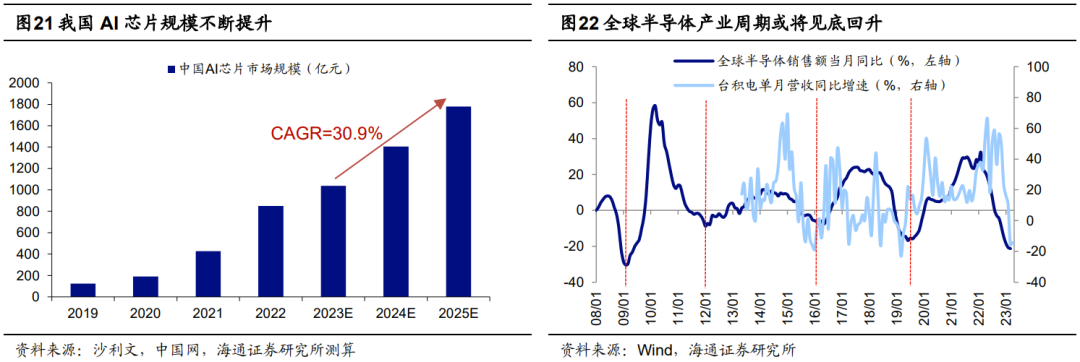 数字经济方面,关注基本面驱动的“去伪存真”方向。在本轮AI技术变革带来的TMT行情中,今年4月以来板块已明显调整。我们在《借鉴13-15年,这次TMT行情到啥阶段了?——对比历史看数字经济系列1-20230523》中分析过,借鉴13-15年TMT行情经验,在经历了**波估值抬升行情后,未来数字经济板块或将进入基本面驱动阶段。而中报前后正是基本面数据验证的窗口期,我们认为或可从政策和技术两个角度寻找订单好转、业绩显现的领域。从政策层面出发,关注数字基建、信创等领域。今年以来多地对数字经济发展提出明确考核要求,我们认为随着各地政府陆续加大对数字经济领域的投入,数字经济中数字基建、数据要素和信创等领域订单和业绩或有望受提振。根据**通服基建产业研究院,预计“十四五”期间我国数据**产业规模复合增速将达到25%。根据华经情报网,预计2025年信创产业市场规模将达到23354.6亿元,22-25年CAGR为35.7%。从技术层面出发,关注人工智能及上游半导体等领域。当前科技巨头正加速布局以ChatGPT为代表的AI模型,新一轮科技变革或将加速到来。其中,算力是AI大模型发展的重要基础,AI大模型的发展将对上游算力相关的硬件领域产生较大拉动,根据亿欧智库,预计23-25年我国AI芯片市场规模复合增速达31%。此外,全球半导体产业每3-4年经历一轮周期,据此推算,2019年开始的这轮半导体产业周期或已进入下行的尾声阶段。当前半导体制造商台积电单月营收增速的降幅从3月的-15%收窄至4月的-14%。往后看,在AI大模型等产业变革的催化下,今年二、三季度半导体产业周期或有望见底回升,届时半导体板块盈利或将改善。