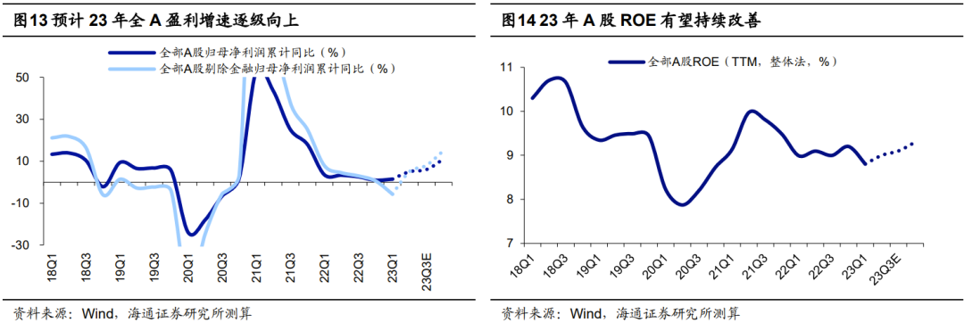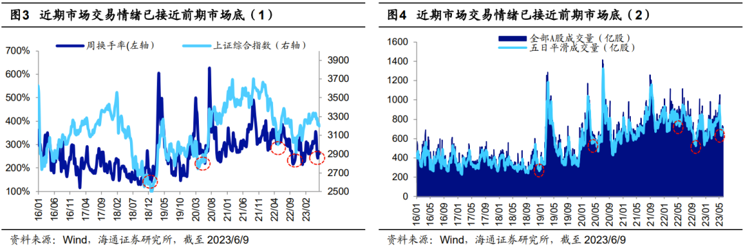 往后看,本次基本面和资金面维度的积极因素有望使得市场悲观预期得以修正。今年二季度以**济修复斜率有所放缓,为实现我国全年GDP增速5%左右的目标,稳增长政策存在进一步发力的可能。6月2日**院总理李强在国常会中指出经济恢复的基础尚不稳固,要进一步稳定社会预期,提振发展信心,激发市场活力,推动经济运行持续回升向好。据证券日报官方公众号报道,6月8日包括工商银行、农业银行、建设银行、**银行、邮储银行和交通银行在内的六家国有大行再度下调存款挂牌利率。后续若政策进一步发力稳增长,宏观经济或迎来更强劲的复苏,进而在微观层面支撑A股企业盈利加速上行,我们预计23年**A股归母净利润同比增速有望达10-15%,Q2-Q4盈利或逐季度改善。此外从资金面角度看,6月8日证监会主席易会满在第十四届陆家嘴论坛上表示将进一步推动各类中长期资金加大权益类资产配置。外资方面,6月7日,摩根大通资管新兴市场&亚太股票投资组合经理Ayaz Ebrahim表示,基于**股票现在的估值,摩根大通资管正在超买**,6月份以来(截至6月9日)北向资金已合计净买入85亿元,6月2日更是单日净买入85亿元,创近4个月新高。总体而言,未来在基本面及资金的积极催化下,A股情绪有望边际修复,进而推动市场行情重新向上。