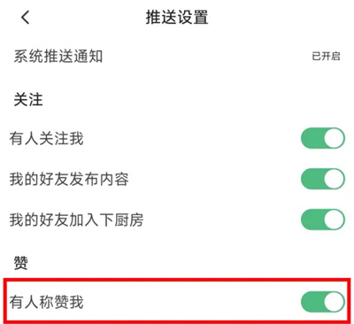 4.**,在推送设置页面里有一个“有人称赞我“,在它的后面点击对应的开关按钮,把按钮设置为彩色状态时代表开启,当其他用户称赞我们时就会推送消息通知。