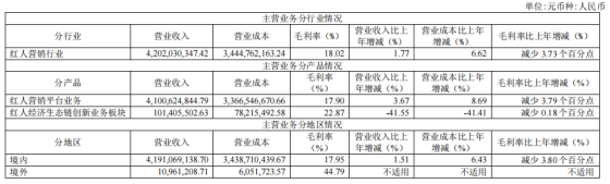 分业务看,红人营销平台业务期内实现收入41亿元,同比增长3.67%,在营收中的占比超过97%;同期红人经济生态链创新业务取得收入1.01亿元,同比下滑41.55%,在营收中的占比不足3%。此外,两者的毛利率均出现下滑,分别降至17.90%和22.87%。