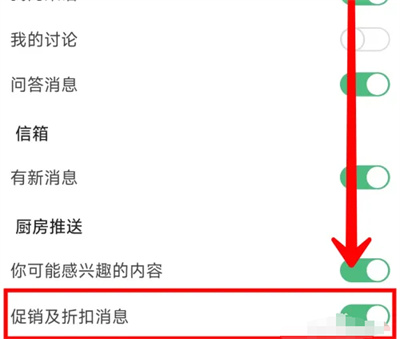 4. **在推送设置页面里找到“促销及折扣消息”,在它的后面点击对应的开关按钮,把按钮设置为彩色状态时代表开启,有新的促销折扣时就会对我们推送消息通知了。