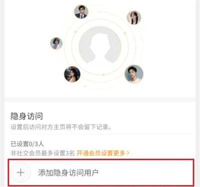 4. **在进入的页面里最下方有一个“添加隐身访问用户”,在它的前面点击带有“ ”图案的圆形图标,把想要设置隐身访问主页的用户添加进去即可。