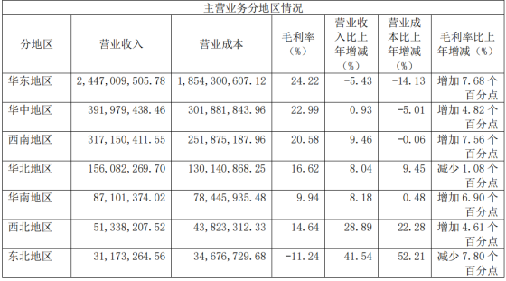 根据门店布局,华东、华中、西南均是紫燕食品发展的主要区域。上述3个区域在2023年的营收分别为24.47亿元、3.92亿元和3.17亿元,同比增幅分别为-5.43%、0.93%和9.46%。尤其是华东区域,作为公司的大本营,其业绩表现承压。
