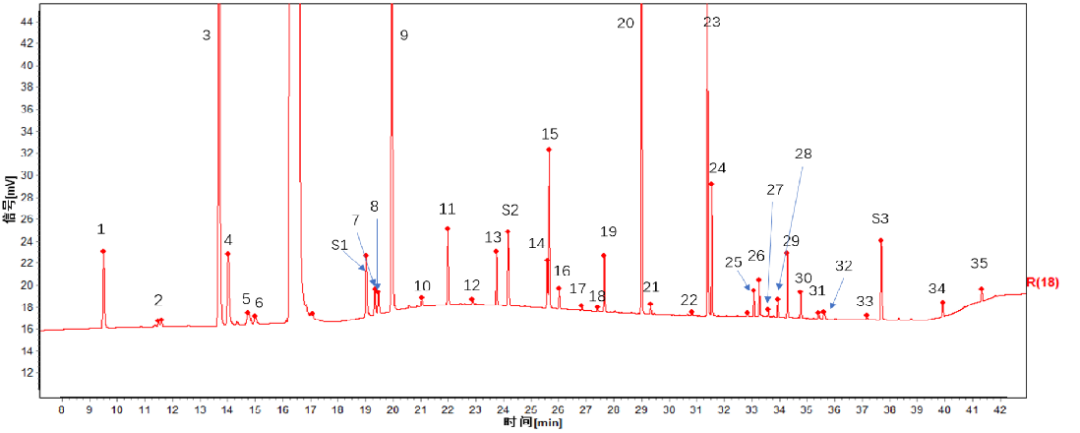 2021年,国台采用气相色谱法,选择多批次感官品评无差异的国台国标酒样品,对35种成分进行分离和检测,得到国台国标酒的气相指纹标准图谱,也是对照指纹图谱。换句话说,国台建立了一个能对照的标准图谱,为一瓶国台国标酒打造了独一无二的身份认证秘密。