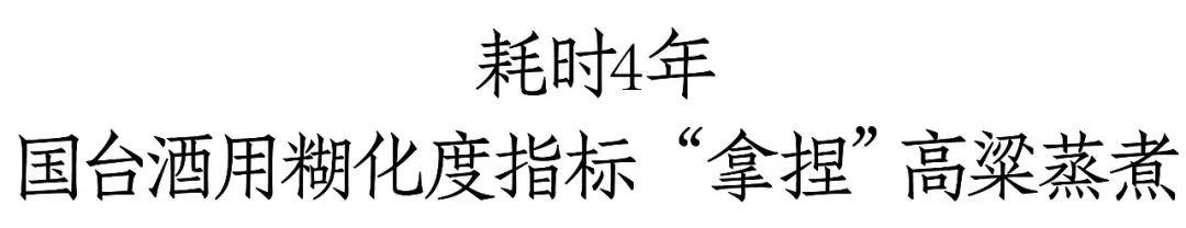 国台**了数字化解析蒸粮程度的糊化度指标评价方法,也就是传统主观判定标准“七分熟”对应的糊化度指标数据为“10%≤糊化度≤16%”,传统主观判定标准“八分熟”对应糊化度指标数据为“25%≤糊化度≤32%”,来科学指导粮食的蒸煮程度。