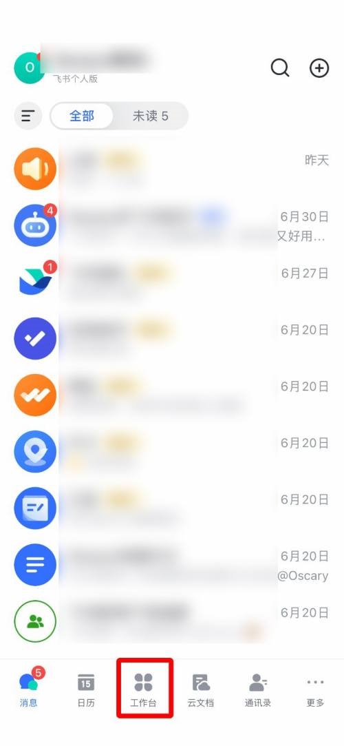 1、首先打开飞书,点击底部导航中的【工作台】。