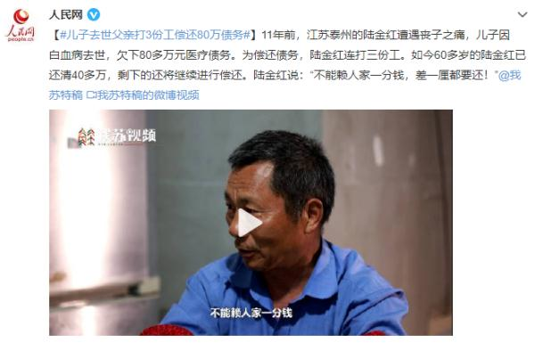江苏这位父亲是一个**守承诺的人,在十多年前,他的孩子得了白血病。为了救他孩子的命,他向亲戚好友四处借钱,借了80万的债务,就是为了给孩子**白血病。但是命运何其残酷,他们孩子的病并没有被**好,在孩子去世之后,这位父亲就开始外出打工。对于他来说,在孩子治病这一期间产生的医药费,都是向别人借的,所以他必须要还给人家。为了将钱还给别人,他一天要打三份工,他的妻子每天也是在家里做手工,夫妻两天天工作攒钱,就是为了偿还债务。