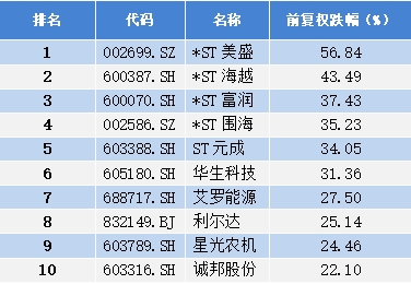 4月浙江省内上市公司跌幅前10名: