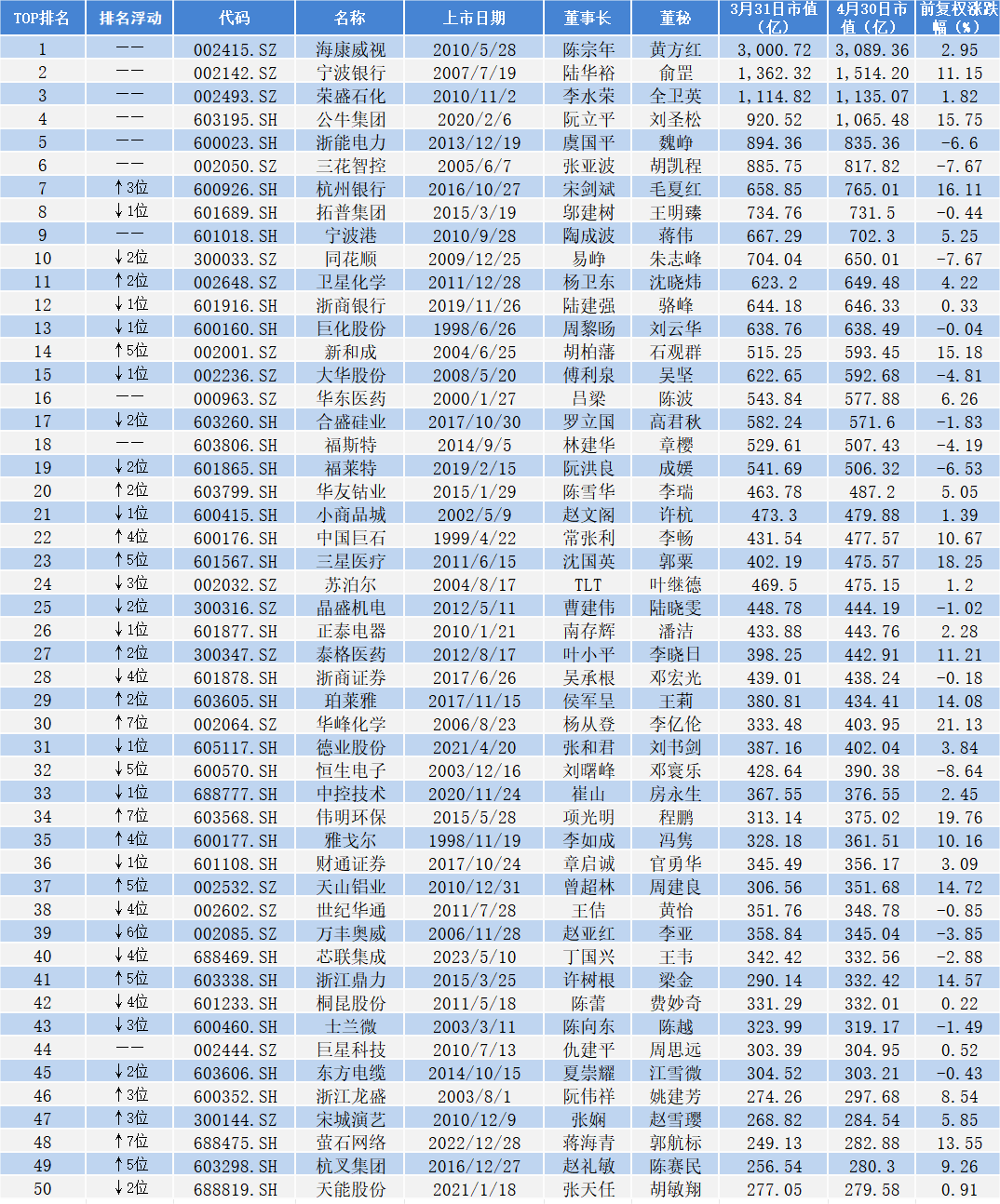 浙江省内上市公司市值TOP50排行榜