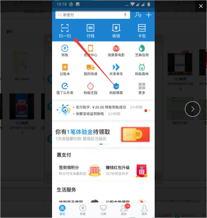 2、然后进入到支付宝首页里,选择激拦红色箭头所指处的“扫一扫”,点击进入。