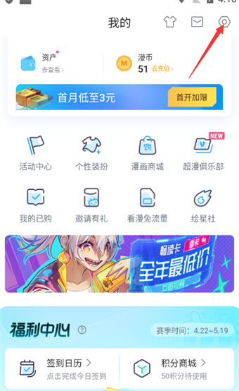3、接着在个人界面找到右上角的齿轮图标【设置】选项。
