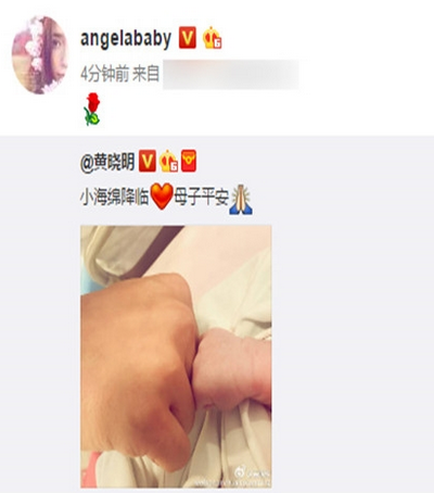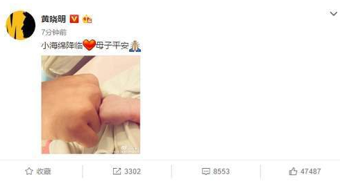 的有关信息介绍如下:17日,angelababy香港产子,黄晓明升级爸爸。中午1时许,黄晓明微博梁链神报喜,晒出与儿子“对拳”照,并附文:小海绵降临,母子平安。