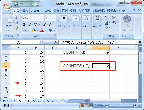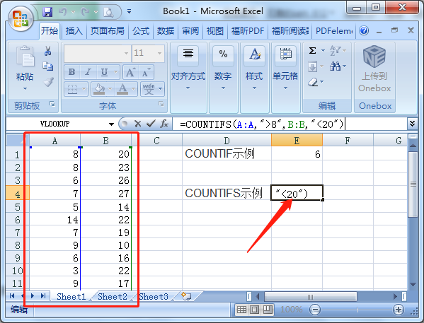4、在E4单元格输入“=COUNTIFS(D:D,">8",C:C,"<20")”,计算A列中数值大于8且同一行B列中数值小于20的单元格个数。