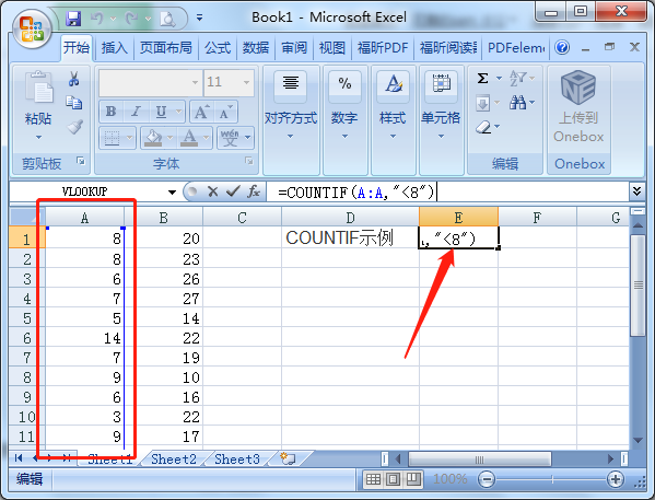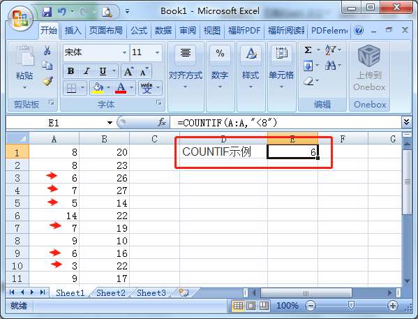 2、在E1单元格蚂消悔输入“=COUNTIF(D:D,"<8")”,计算A列中所有数值小于8的单元格个数