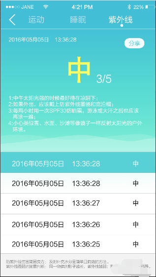 8、针对不同的强度,APP提示不同的**建议历轿,让你的皮肤和眼睛得到呵护。