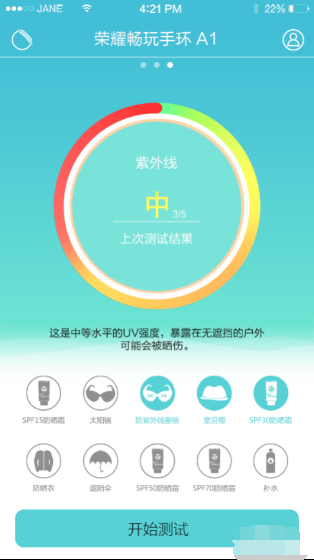 6、UV测试A1提供了紫外线强度测试功能,并根据测试棚烂伏结果给出人性化的**建议,先选择手环版本。