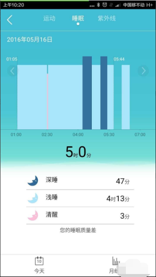 5、这是睡眠记录的详情界面,识别深睡,浅睡和清醒状态,并开始睡觉和起床时间点。