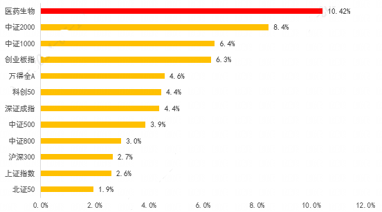 Wind数据显示,申万医药生物指数近20天(2024/4/19-2024/5/9)上涨了10.42%,领涨31个申万**行业,也远超同期A股主流指数表现。