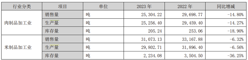 酱卤肉制品加工业务和米制品业务作为煌上煌的两大主营业务,2023年生产量分别同比下降14.27%、6.56%,销售量分别同比下降14.80%、6.32%。其中,酱卤肉制品加工业务近年来营收占比多数在70%以上,其销售量早已于2021年、2022年连续下降,降幅分别为8.44%、19.05%。