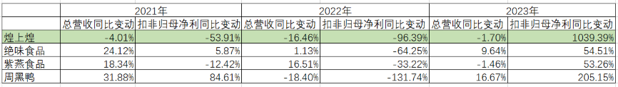 与同受**宏观经济态势和市场环境变化影响的同行业公司相比,煌上煌业绩下滑的时间相对较早,波动最为剧烈。在煌上煌、绝味食品、紫燕食品及周黑鸭四家主营业务为卤味的可比公司中,2021年煌上煌为**一家营收同比下降且扣非归母净利润下降幅度超50%的公司,2022年其业绩下滑幅度在四家公司中相对较深,2023年其业绩,尤其是扣非归母净利润同比反弹幅度亦相对较大,整体业绩波动程度相对较深。