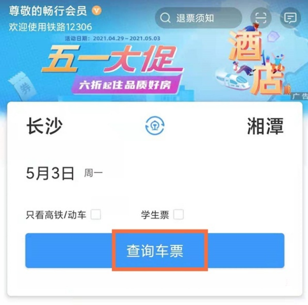 1、打开铁路12306app,选择出发点和目的地,点击查询车票。