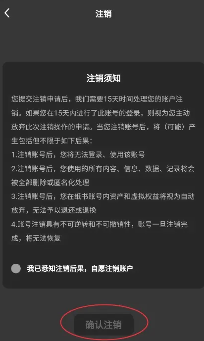 5、勾选我已知悉注销后果,点击确认注销即可。