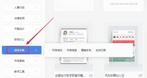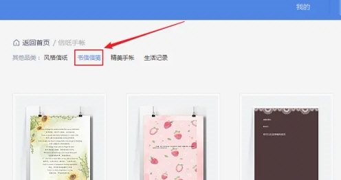4、在打开的信纸手帐页面中,点击分类中的书信信笺。