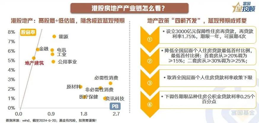 就港股高股息资产而言,其中“预期差”修复空间较大的品种是地产产业链。一方面,从港股各行业的市净率和股息率水平看,0.4倍PB、5%股息率的地产建筑行业具备很高的安全边际。