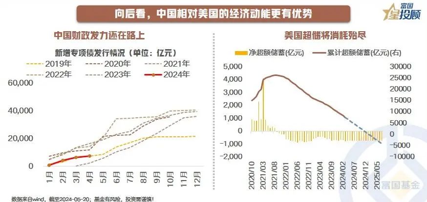 一方面,**相对美国的经济动能更强。其中,**在财政&地产政策落地后,经济修复弹性有望抬升;而美国在超储逐渐耗尽的背景下,经济动能或走弱。另一方面,若美联储开启降息周期,全球流动性改善,港股也能“水涨船高”。