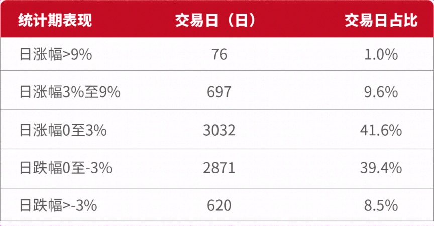 涨幅超过9%(接近涨停)的,仅76个交易日,占比1%;
