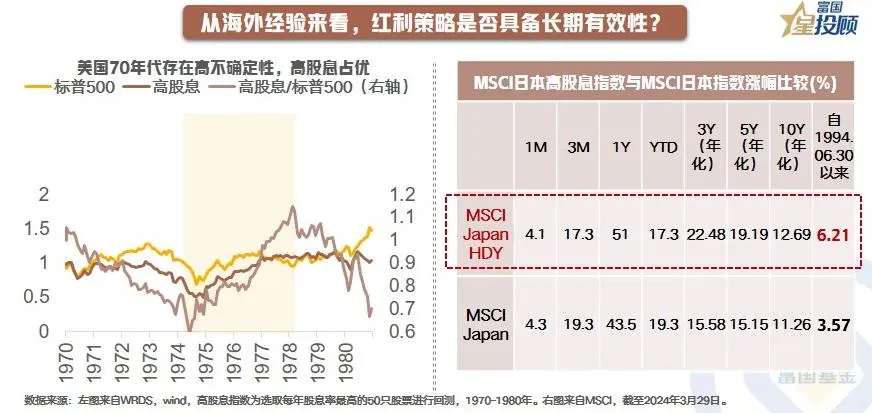 以史为镜,无论是在美国70年代,还是日本“消失的二十年”,红利资产都是时代的**资产。以美国为例,70年代的美国经历了大的经济动能切换,在**次石油危机后,通胀和利率明显回落。在此背景下,红利策略成为当时更具确定性的投资机会,跑出了明显的超额收益。同样,日本步入低增长时,红利策略同样有效。在日本“失去的三十年”中,高股息股票展现出较强的超额创造能力,MSCI日本高股息指数的年化收益率为6.2%,而MSCI日本指数仅3.6%。