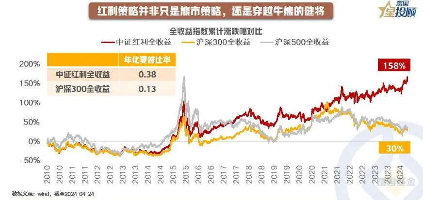 红利策略并非只是熊市的防御策略,更是穿越牛熊周期的长跑健将。2010年以来,对比累计收益率情况,中证红利全收益指数达到158%,而沪深300全收益指数仅30%;另外,从年化夏普比率这个风险收益“金手指”看,中证红利全收益指数是0.38,也显著高于沪深300全收益指数的0.13。由此可见,红利策略不仅长期业绩占优,而且性价比更高。