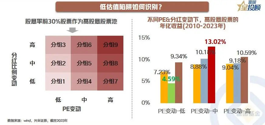 在红利资产的选择上,相比估值的高低,更重要的是关注估值的稳定性,且分红比例能持续提升是“真红利”资产的必备条件。一个简单的测算方式是,将**场2023年底股息率**的30%股票作为高股息股票池,并根据2010-2023年PE和分红比例的变化率,分别按“高-中-低”分组,两两组合后,共9组样本,并考察它们在2010-2023年的表现。从结果看,分红比例提升幅度高,且PE较稳定的这一组表现**,年化收益达到13.02%,它们的股息率提升主要来源于分红比例提升,属于真正高质量的红利资产;而分红比例较为稳定,而PE不断下行的这组表现最差,年化收益仅4.59%,它们的股息率提升主要来源于估值的下降。