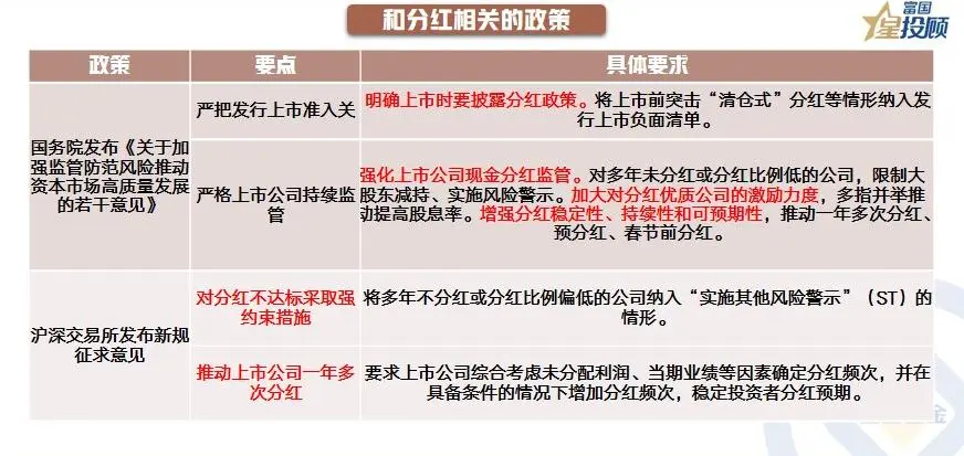 新“国九条”针对上市公司分红提出了更高要求,包括强化上市公司现金分红监管,加大对分红优质公司的激励力度,增强分红稳定性、持续性和可预期性等。无独有偶,沪深交易所也配套发布了新规征求意见,包括加强分红约束、推动上市公司一年多次分红等内容。在接连的政策驱动下,上市公司分红情况改善将为红利策略拓宽选择空间,红利投资的理念也有望进一步强化。