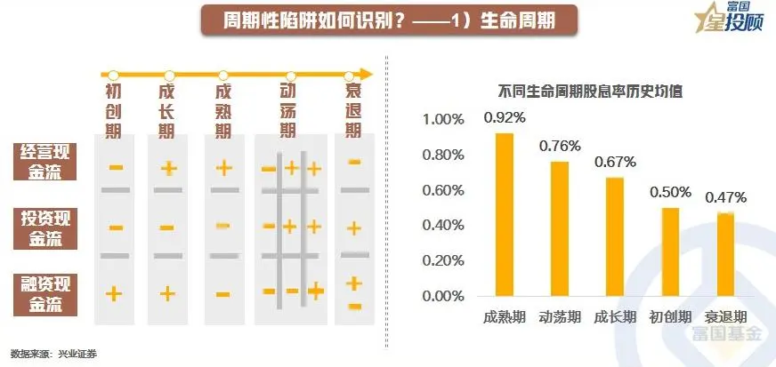 在股息率视角下,红利策略可能陷入两大陷阱,分别是低估值陷阱和周期性陷阱。低估值陷阱是指部分股票的股息率较高,是来自于估值的下滑,而非是分红比例的提升,买入这样的股票之后,就可能出现股价持续下跌的情况。周期性陷阱是指部分股票的股息率较高,可能是由于分红时所对应的净利润正好处于周期的顶部,或是股息支付率处于历史高位,这也就意味着,当前的高股息率较难持续。那么周期性陷阱应当如何识别?可以从生命周期、库存周期、盈利周期三个维度出发,通过考察股票在这些周期中的具**置来判断。