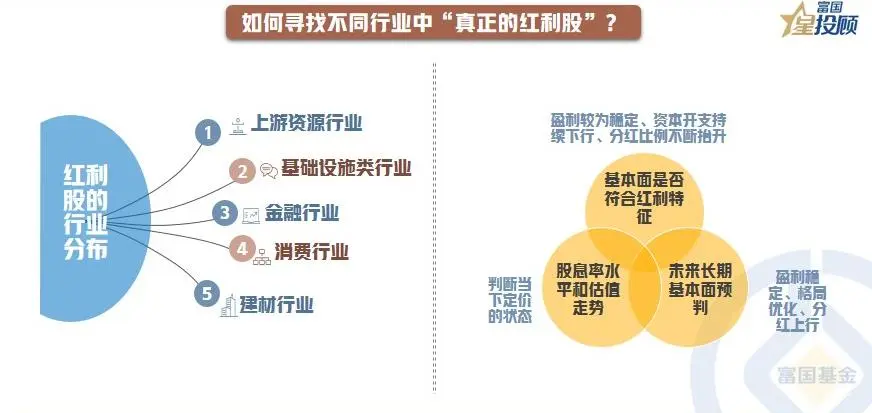 一般而言,红利资产大多分布于以下几类行业,如上游资源、基础设施、金融、消费、建材行业等。但具体到细分行业的筛选,我们也需要**考虑以下要素:一是看行业过去几年的基本面是否符合红利特征,如盈利较为稳定、资本开支持续下行、分红比例不断抬升等。二是考虑行业当前整体的股息率水平与估值走势,判断当下定价的状态。三是要对行业未来长期基本面进行预判,如未来是否能够继续维持盈利稳定、格局优化、分红上行等。