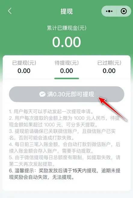 3、当赚取的金额满足0.3元即可点击按钮进行提现。
