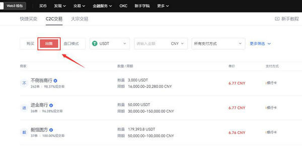 3.进入C2C交易,我们点击出售会发现,自选卖币有不同的价格选择,我们有很多商家可以选择,能够选择到比快捷买卖更高的出售价格。在这个页面,就能够将USDT转化**民币了。