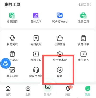 1、打开百度文库app,点击右下角我的,再点击设置。