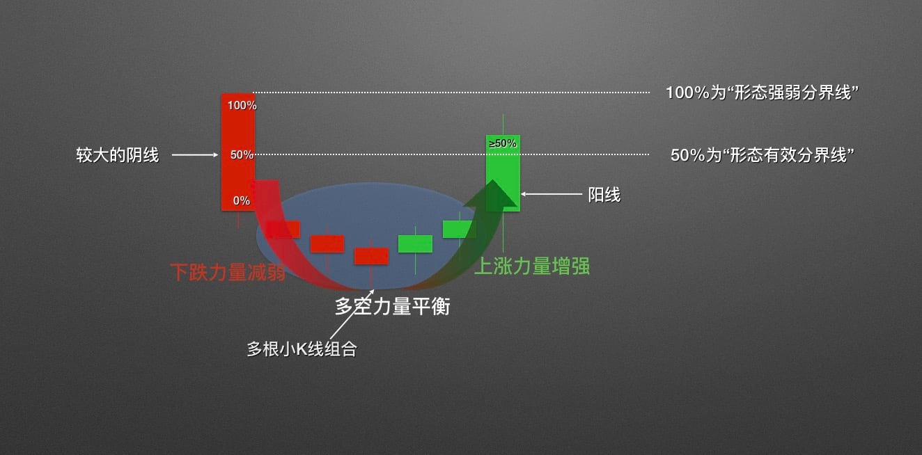一个有效塔形底要满足:**一根阳线的收盘价格要超过前面大阴线实体的50%。塔形底展现的是:市场中做空力量逐渐减弱,至多空力量平衡,**到上涨力度增强的过程。