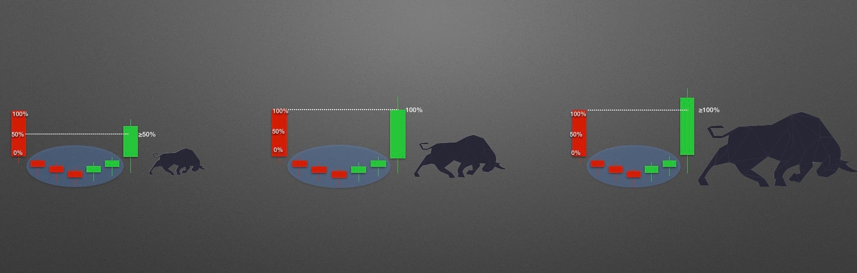 左一,上涨阳线实体刚刚吞前面下跌阴线实体,该组合看涨力度最弱;中间,阳线实体明显高于前面阴线实体,甚至达到前阴线的两倍,该组合看涨力度很强右边,阳线实体一举吞没前面多根阴线,该组合看涨力度**。