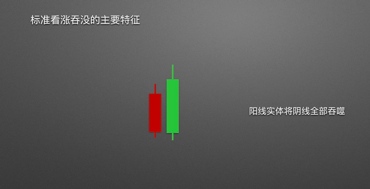 首先,看一下看涨吞没的特征。后一根阳线实体,**覆盖前面阴线实体,如同阴线被阳线吞噬掉一般,表明多头力量正在大举**。因此得名看涨吞没。