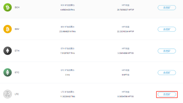 在火币矿池官网页中,查找到 LTC(莱特币)并单击旁边 【去挖矿】按钮。如下图所示:
