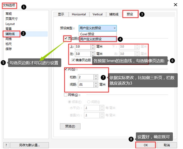 二、在弹出窗口,设置用户自定义选项,设置基础的参数,一般预留3mm的距离作为出血线