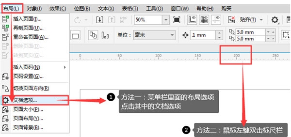 一、打开CorelDRAW软件,依次点击上方【布局】-【文档选项】-【辅助线】打开辅助线选项窗口,或双击【标尺栏】打开