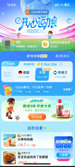 活动期间,饿了么注册用户打开饿了么APP,搜索“免单”、“饿了么免单”、“踢球免单”、“玩游戏免单”、“猜球赢免单”、“踢球”、“猜球”进入活动页面,点击【竞猜模块】参与竞猜及瓜分吃货豆奖励。