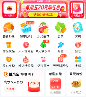 1、首先打开饿了么,我们在主页面选择右上角的全天抢免单。