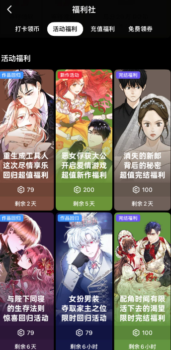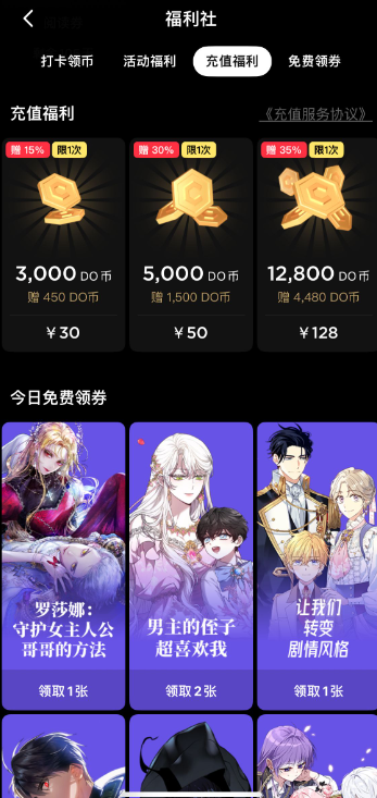 3、福利社:用户在福利社里阅读指定的漫画或小说也可以获得DO币。